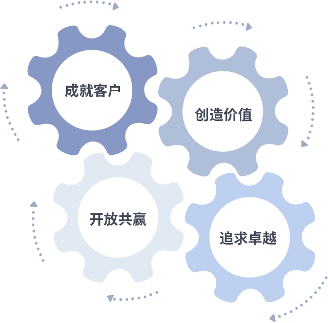 成就客户是一切决策的出发点,,创造价值是衡量所有工作的标准,,,,追求卓越是我们做事做人的态度,,开放共赢是我们的格局也是最终的结果。。。。价值观的齿轮环环相扣,,,,推动着组织里的每个人不断向前。。。。