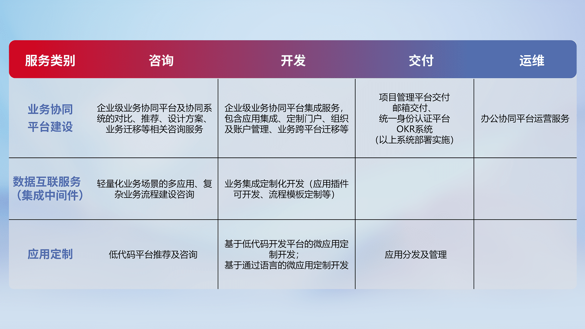 针对钉钉、、企微、、、、IDaas等平台级产品提供产品的规划、、方案、、交付、、、、定制化开发等服务,,实现如统一协同办公、、、智能客户服务、、、、混合会议管理、、、智能数据查询、、等业务场景,,,,实现数字化转型。。。。